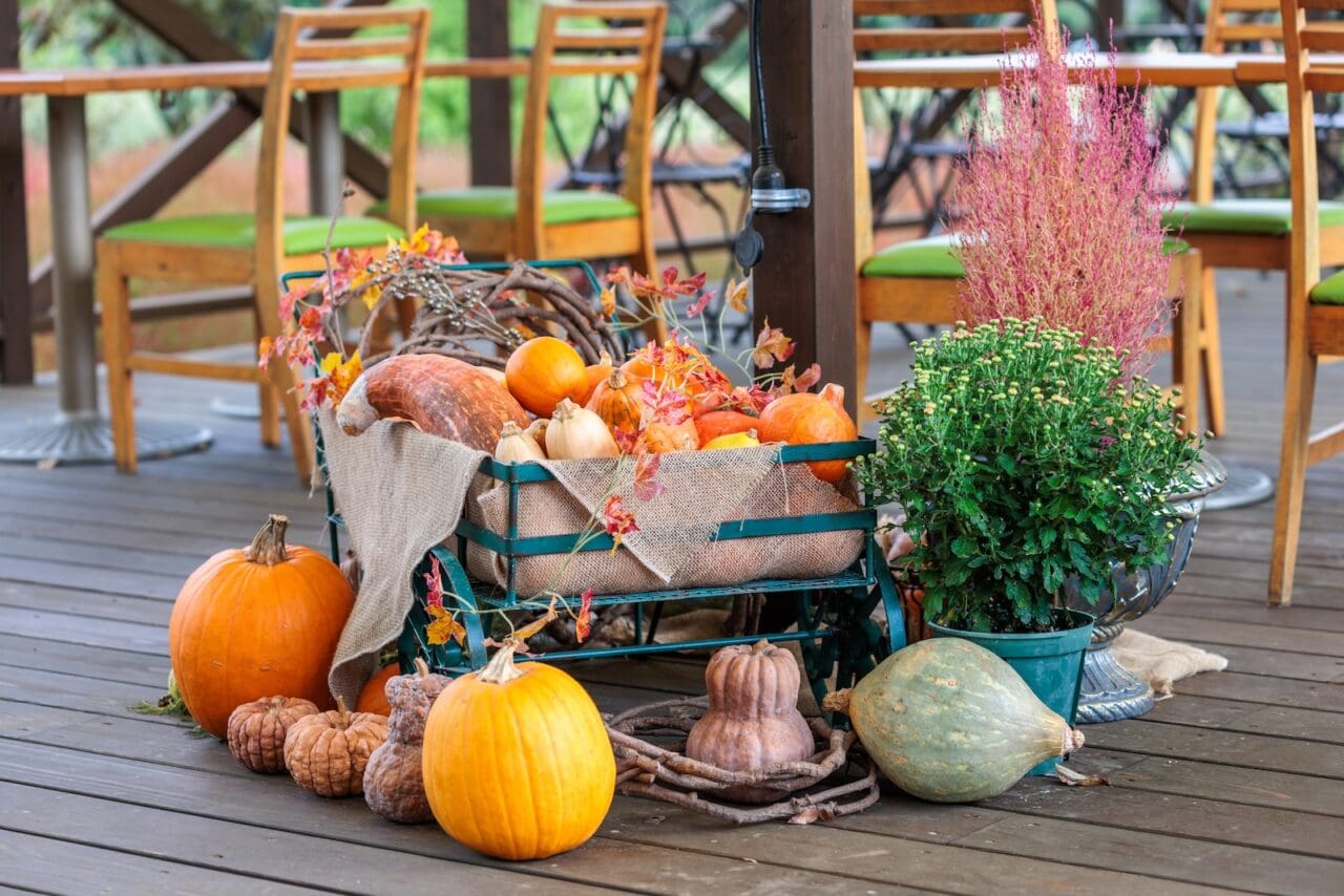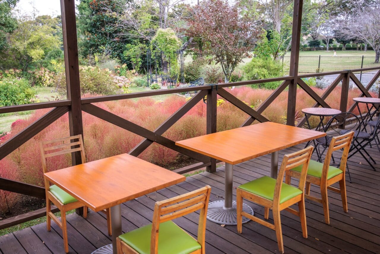 ガーデンカフェ ルーベルのテラス席もハロウィン仕様に。秋のイングリッシュガーデンを眺めながら、特別なひとときをお過ごしください。