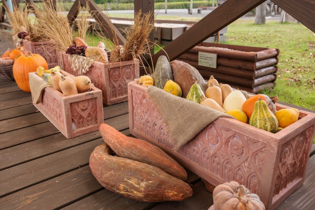 毎年、ガーデンスタッフが心を込めて育てたカボチャを主役に、装飾を手がけています。今年は、昨年のブラックハロウィン風から一新!オレンジとブラウンを基調とした温かみのある装飾で、実りの秋を祝う収穫祭のような雰囲気に生まれ変わりました。