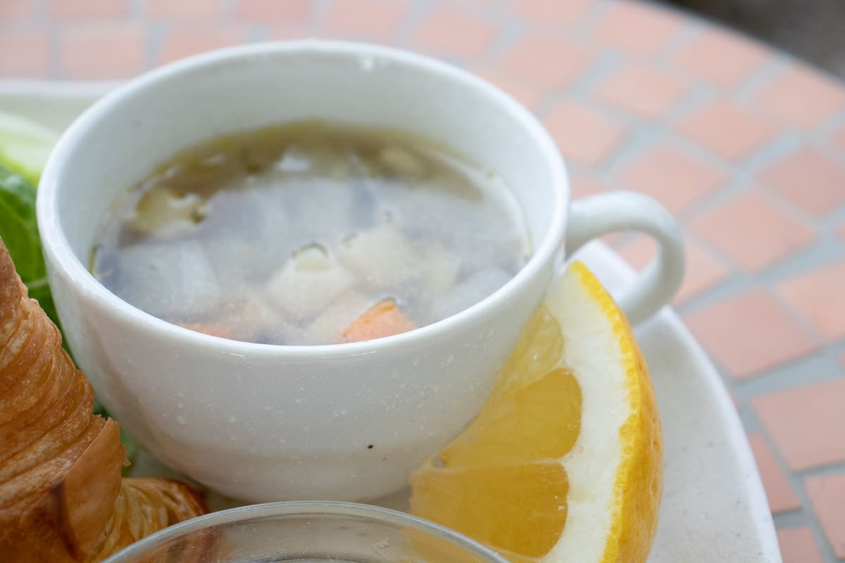 ・付け合わせ:自家製ドレッシングサラダ、具沢山スープ、国産豚ウィンナー、ボイルドエッグ